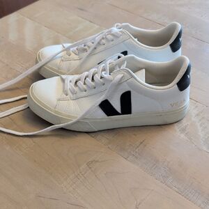 Chic Veja sneakers featuring a white base with black details. Ideal for everyday style.
