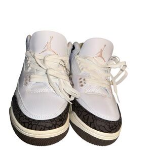 White tumbled leather upper with Dark Mocha elephant print overlays and Atmosphere (pink) accents. Classic AJ3 silhouette.