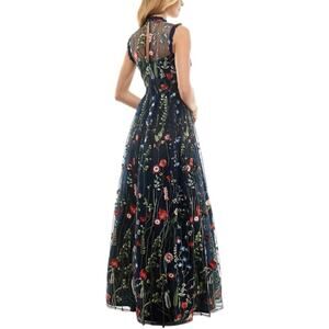 City Studios Floral Embroidered Mesh Ruffle Fit & Flare Tulle Gown. This stunning gown is in a navy blue with colorful multicolor floral embroidery on the mesh overlay. The bodice is fitting with a high neck and the skirt flares out with a full tulle underlay. Maxi length, zipper closure with a hook & eye at the back of the neck.