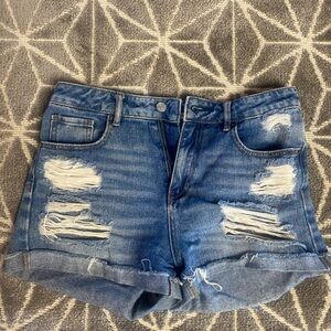 Stylish ripped jean shorts. Classic blue denim. Ideal for casual wear.