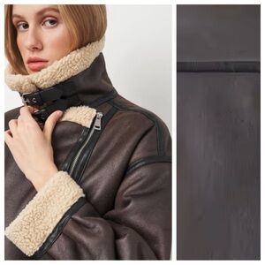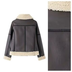 NWOT. Zara Brown Double Faced Aviator Biker Jacket with contrast faux fur interior, adjustable buckles at collar, long cuffed sleeves, front welt pockets, belt with metal buckle at hem, front asymmetric zipper closure. Size S. Pit to pit 20" flat, shoulders 14", sleeves 24", length 23".