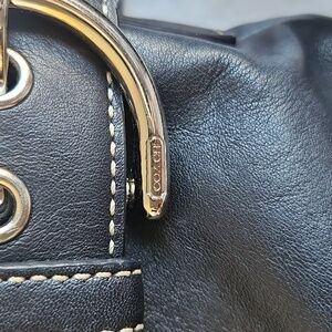 This elegant black leather coach crossbody bag is perfect for any occasion. Featuring a sleek design with silver accents, it combines style and functionality. Ideal for everyday use or a night out. one small spot on the back shown in second Pic.