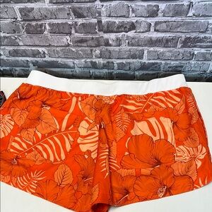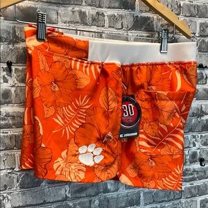 Vibrant orange Clemson shorts with a floral pattern. Features a white paw print detail. New with tags. Size large.