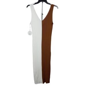 Ribbed knit colorblock sleeveless dress featuring a deep V-neckline in tan and white. Stretchy fabrication with a figure-skimming silhouette.