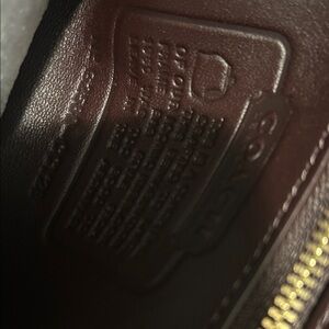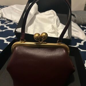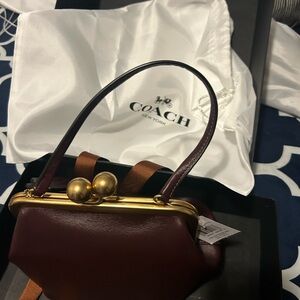 Sophisticated Coach wristlet in dark red leather. Features a classic kisslock closure. Ideal for elegant outings.