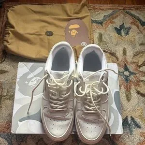 A Bathing Ape Bape sta Low Sneaker - JJJJound White Grey, pre owned in fair condition, flaws visible in photos and only worn a handful of times, view all pictures before purchasing, priced due to flaws, US Men’s size 10.5, comes with box and tag, offers welcome