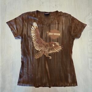 Harley Davidson Women's T-Shirt Rhinestones Eagle Graphic Print. Size Medium. V-Neck. 100% Cotton. In Excellent Preowned Condition. Smoke Free Home.