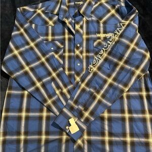 Casual Wrangler shirt with blue and yellow plaid design. Button-down style. Ideal for relaxed outings.