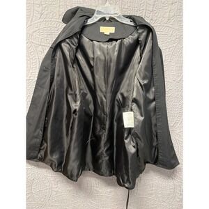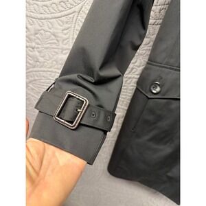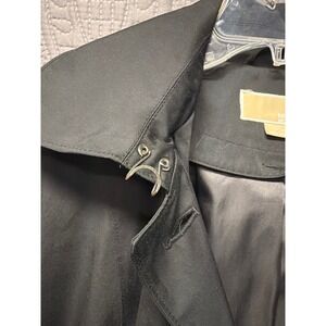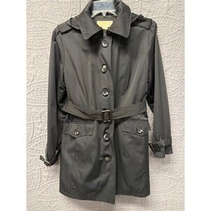 MICHAEL Michael Kors black hooded trench coat. This stylish coat features a full snap button closure, a removable belt to cinch the waist, and convenient front flap pockets. The attached hood offers versatility for changing weather conditions. Perfect for everyday wear, commuting, or a stylish addition to your travel wardrobe.