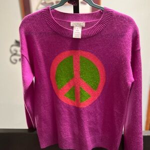 Bright fuchsia sweater with a bold green peace sign. Stylish and eye-catching design. Excellent condition from a smoke free home. Length 24”, pit to pit 20.6”