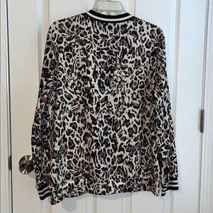 Stylish leopard print jacket for women. Features a chic design with black and cream tones. Perfect for adding a bold touch to any outfit. Excellent condition!