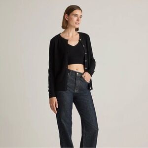 Sleek black cardigan from Quince. Ideal for layering. Offers timeless style and comfort.