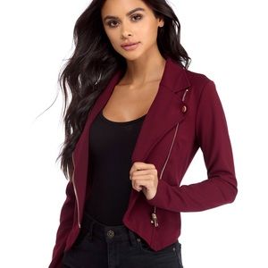 Chic burgundy blazer with gold zipper accents. Perfect for a stylish look.