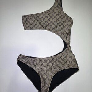 Authentic Gucci one-shoulder swimsuit featuring the iconic GG monogram print in classic brown. Designed with a bold asymmetrical neckline and modern side cutout for a sculpted, high-fashion silhouette. Fully lined with stretch for a secure, flattering fit.
