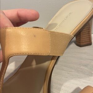 Step out in style with these elegant tan heeled sandals. Perfect for any occasion, these shoes offer both comfort and sophistication. Worn a few times. Pictures show wear and tear.