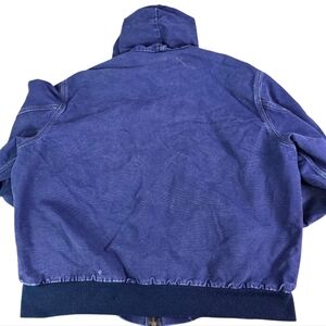 Carhartt hooded jacket in blue heavy denim canvas. Features a front zipper and pockets. Nicely thrashed with some distressing on cuffs and a little here and there throughout. Beautiful honeycombing on the arm and some minor paint splattering add to its appeal. Minor pilling on cuffs and hem. No longer able to read the vintage tag due to age to get sizing. Please see measurements for fit and compare then to a coat you already have to make sure it will work. Estimated size XL-XXL. As this is a vintage work coat other flaws may be present. Perfect for a second life work coat or likely a cool vintage workwear 'fit.