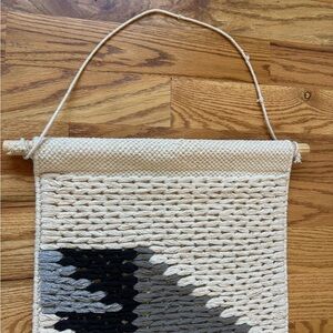 Enhance your home decor with this handwoven wall hanging. Featuring a modern design in black, blue, grey, and cream, this piece adds bohemian vibes.