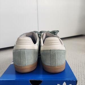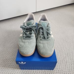 Stylish Adidas Samba sneakers in green suede with white stripes. Features a classic gum sole.
