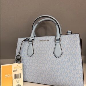 Chic Michael Kors satchel in sky blue. Features signature MK monogram. Stylish and versatile.