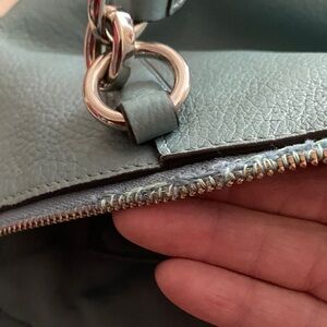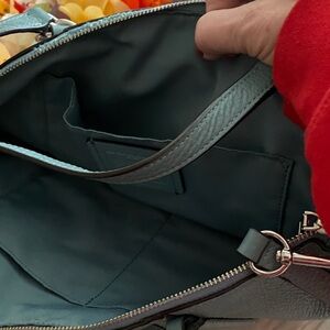 Stylish Coach tote in rich blue leather. Features sturdy handles and elegant design. Perfect for daily use.