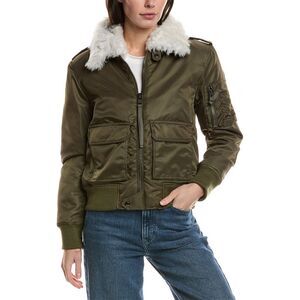 Color/pattern: green Approximately 21in from shoulder to hem Model is 5'9 and is wearing a size small. Measurements may vary slightly by size. Design details: spread collar, front flap pockets, and ribbed trim Zipper front 100% nylon Lining: 100% polyester Trim: 100% lamb shearling Clean by a fur specialist Imported