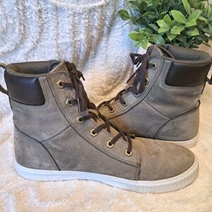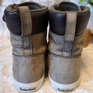 Stylish Timberland lace-up boots for women. Features brown leather with black accents. Durable and comfortable design.