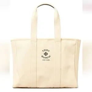 Stylish Tory Burch large canvas tote in beige canvas. Ideal for daily use. Features iconic logo design. Brand new and never used. Retails for $348.00.
