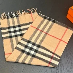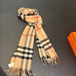 Luxurious cashmere scarf with iconic Burberry pattern. Features beige, red, and black tones.