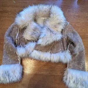 Chic faux fur jacket by Hot & Delicious. Elegant cream and tan design. Perfect for stylish layering.