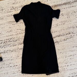 Chic black midi dress with wrap design. Short sleeves and elegant silhouette. Size 2.