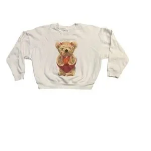 Crewneck fleece sweatshirt featuring teddy bear graphic holding a heart. Long sleeves with ribbed cuffs and hem. Soft fleece interior with relaxed fit, ideal for casual wear or cozy lounging.