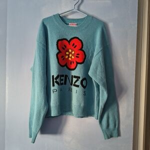 Kenzo Boke Flower Turquoise Blue Wool Crew Neck Sweater S
