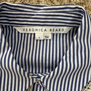 Veronica Beard blue and wile striped long sleeve shirt. Ivory colored crocheted lace detail over shoulders running down front and back. Collared button up style. Has front darts and fitted seams down back. A very cute shirt that has never been worn. NWOT!