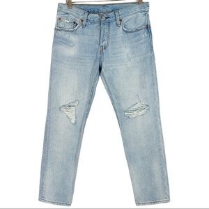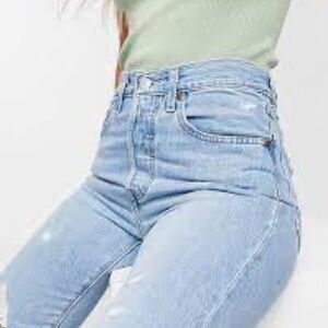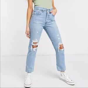 Levi's 501 Cropped With Ripped Knees Light Wash Size 26. Features: Wear, wash, repeat Distressed finish. High rise. Five pockets. Branded patch to reverse