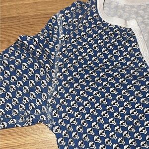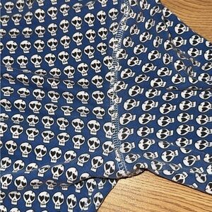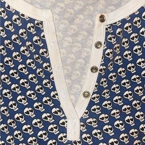 Comfortable blue pajama set with a buttoned top. Features a skull pattern.