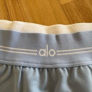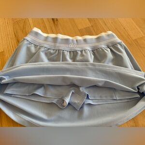 Alo Yoga Airbrush Better Together Tennis Skirt. Color is Seashell Blue/White. Size tag has been removed, but it is a Small. Measurements included in the pictures. Has built-in shorts underneath. Excellent condition. This color way is no longer available from Alo.