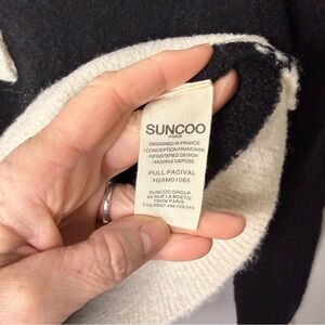 Elegant and timeless SUNCOO knit sweater featuring a classic black and ivory color-block design with a chic collared neckline. Finished with gold-tone button details and faux pocket accents for a polished, Parisian-inspired look.
