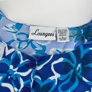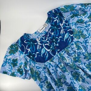 Vintage Loungees floral cotton muumuu / caftan dress in blue, teal, and green with a darker blue empire yoke and button-front detail. Features short sleeves, gathered body, and a soft border-style floral hem. Lightweight, breathable cotton with an easy slip-on fit.
