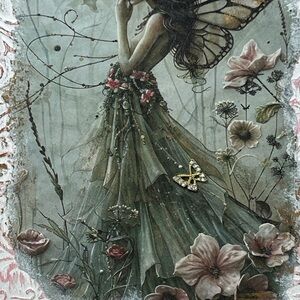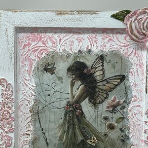 Enchant your space with this fairy art decor featuring a delicate pink and white frame. Perfect for adding a touch of whimsy to any room.
