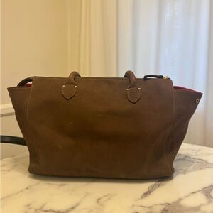 Clare V. Beatrice Tote in chocobar Italian nubuck leather. I love this bag! I don’t use it as much as I thought I would. She’s in great condition and was my travel tote all over France this summer. A few minor scuffs but that is normal for this kind of soft leather. I took very good care of this bag. She’s can easily fit a laptop, wallet, notebook, water bottle, cosmetic case, etc.
