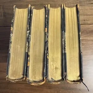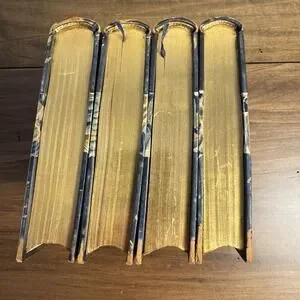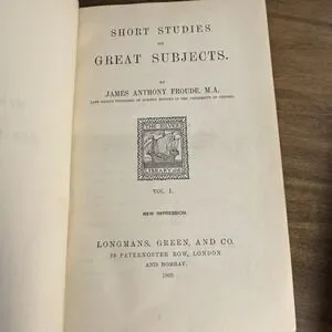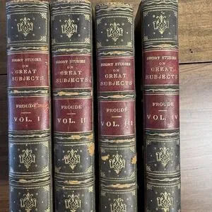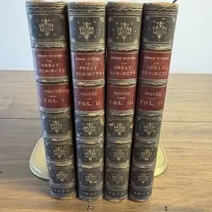 James Anthony Froude / Short Studies on Great Subjects 4 vols 1903 Vols 1-4 I think these books are in very good preowned condition for their age, with signs of usage. See pictures for cosmetic details such as any scratches, scuffs, marks, or discoloration. The books have a slight twist that you can see in the photo of the book laying on the desk. I am not a book dealer, nor am I a book expert, but I do love books Thank you!