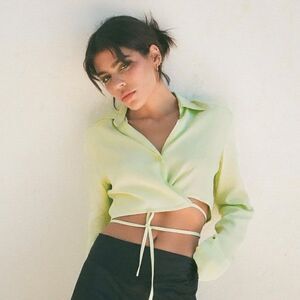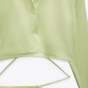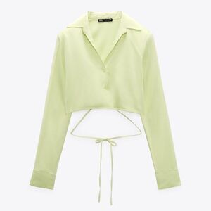 Cropped collared shirt with a V-neckline, long cuffed sleeves, a front tied hem and a button-up front.