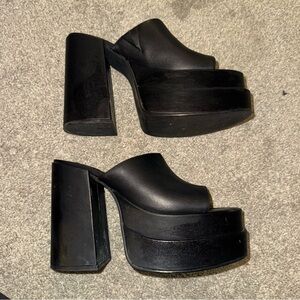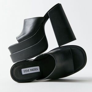 A double-soled platform and towering block heel elevate this retro-inspired sandal from Steve Madden. Constructed with a smooth leather finish.