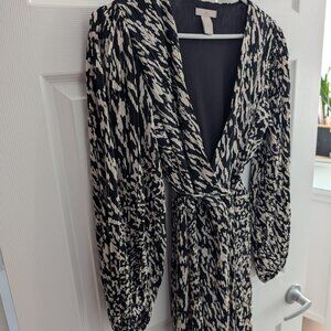 Black and white pattern midi wrap dress with plunge v-neck in crinkle fabric with balloon sleeves
