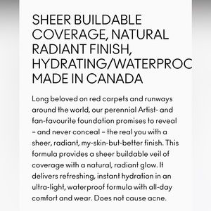 An ultra-light, waterproof foundation that provides a sheer buildable veil of coverage with a natural, radiant glow.