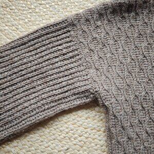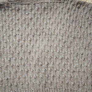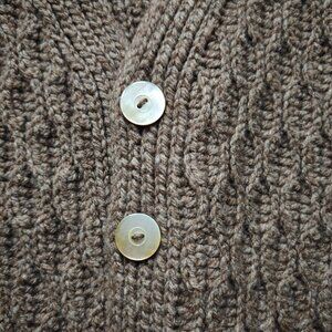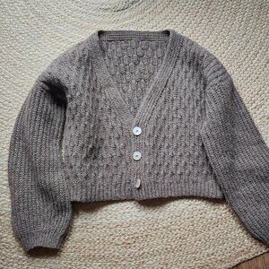 Hand crocheted cardigan in 100% wool (De Rerum Natura Gilliat from France) with shell buttons. Beautiful cardigan made of extremely nice yarn with more than 50 hours of crochet time put into it. Unfortunately it's slightly too small for me--just enough to be annoying to the point I don't reach for it, which is a tragedy for a handmade item--so I need to remake it in a larger size. IT features a v-neck, slightly cropped and boxy body, and buttons made of shell that are beautiful and irredescent. The pattern is the Rockmore Cardigan, featured in Pompom Magazine, with an all over honeycomb stitch body and rib stitch on the slgihtly balloony sleeves. It's a one-of-a-kind, very special sweater looking for it's perfect home :)