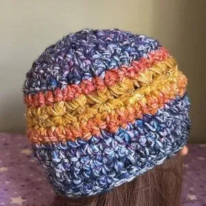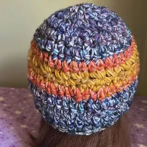 Colorful Knit Beanie with Blue Flower Accent medium soft acrylic yarn new
