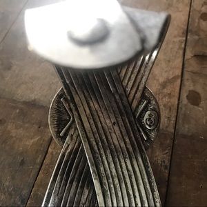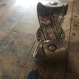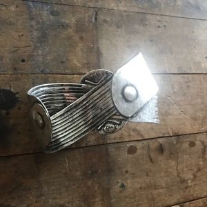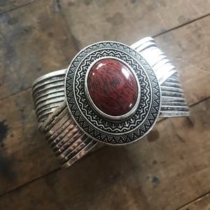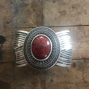 Silver tone crisscrossing cuff bracelet with oval centerpiece brown stone with flecks. Gently used.