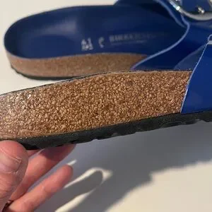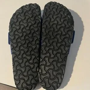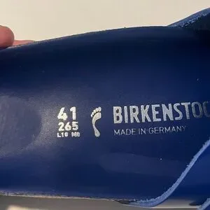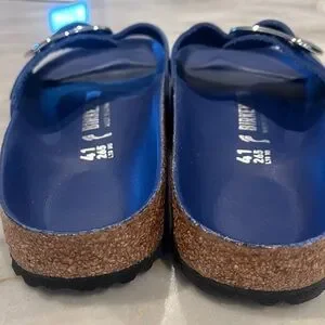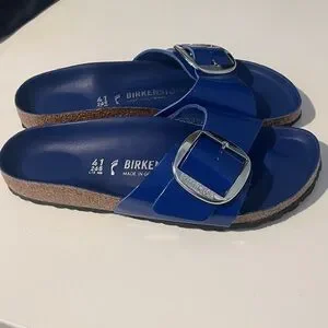 New without box/never worn/no scratches royal blue Birkenstock Madrid leather and cork slides. Just missing the box! Get these for almost 1/2 the price on their site.