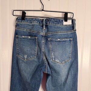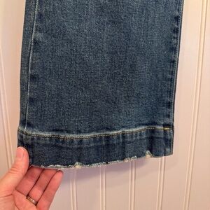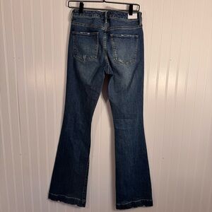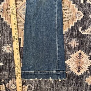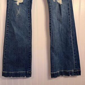 These jeans are so well made, they have great structure to them. The bottom hem looks like a faux cuff look. 32” inseam. High-Waisted. Bootcut. Distressing throughout.